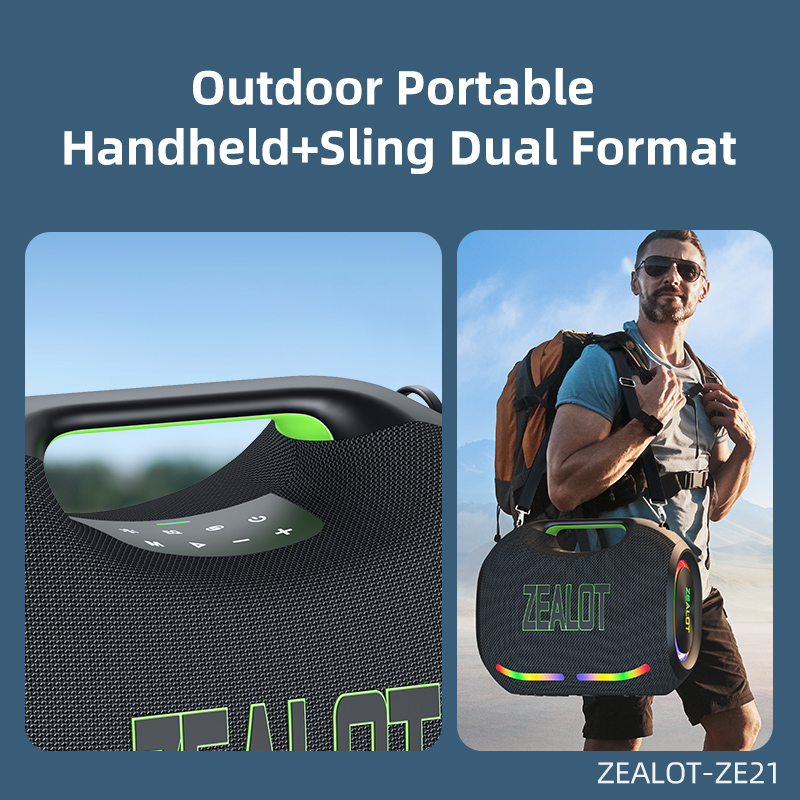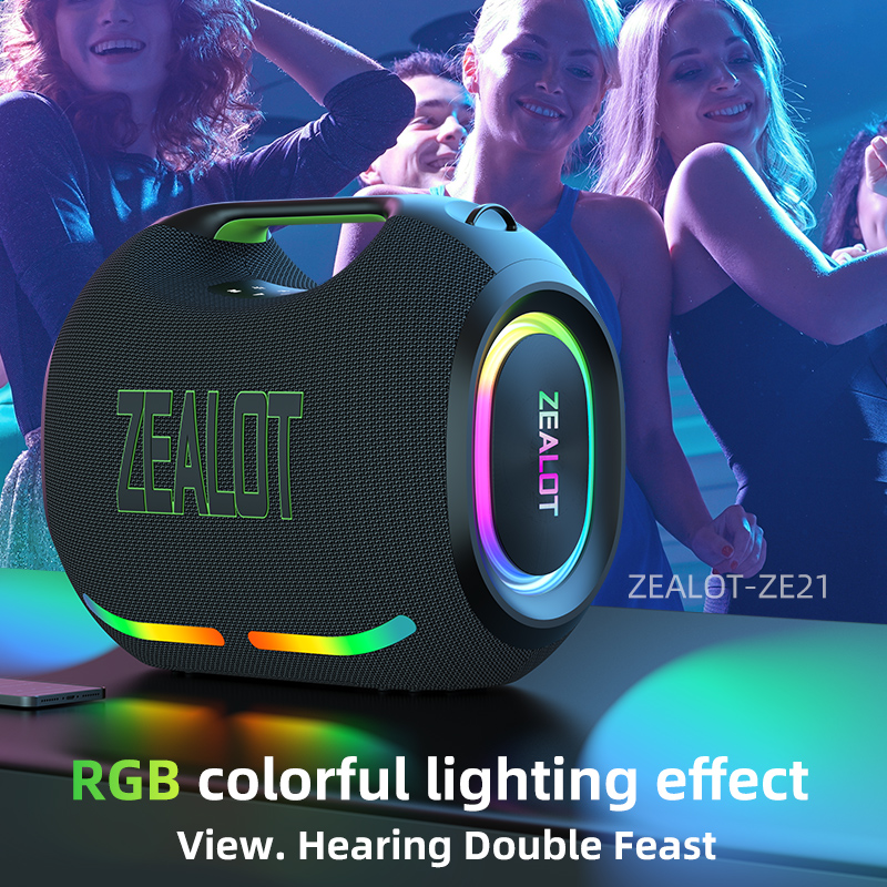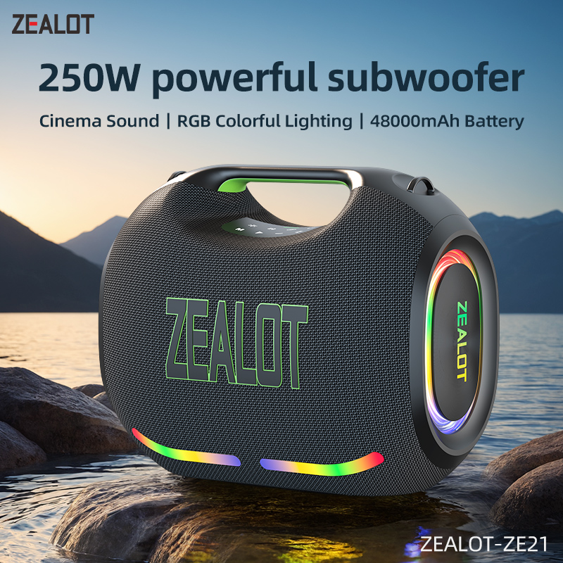 ZEALOT ZE21 250W portable speaker with 2 wireless microphones, RGB lights, and equalizer, supporting TWS/TF/USB/AUX home parties